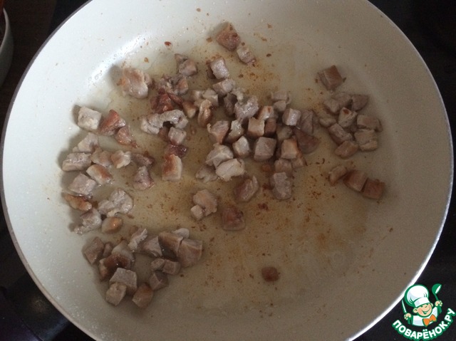 - Далее мясо еще в теплом состоянии порезать кубиками.