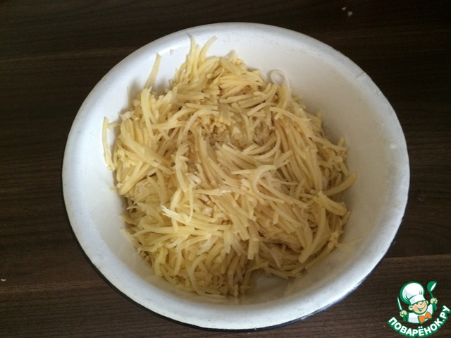 Очищенный картофель натрите на корейской терке. Чтобы картофель не темнел, трите его в кастрюлю с холодной водой.