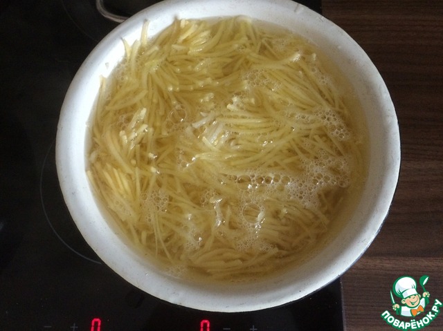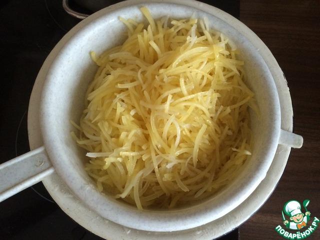 2. Картофель нашинковать на корейской терке, промыть и положить в кипящую воду на 1 минуту постоянно помешивая. Не передержите, на вкус картошка должна похрустывать