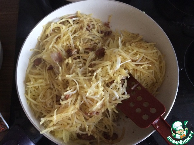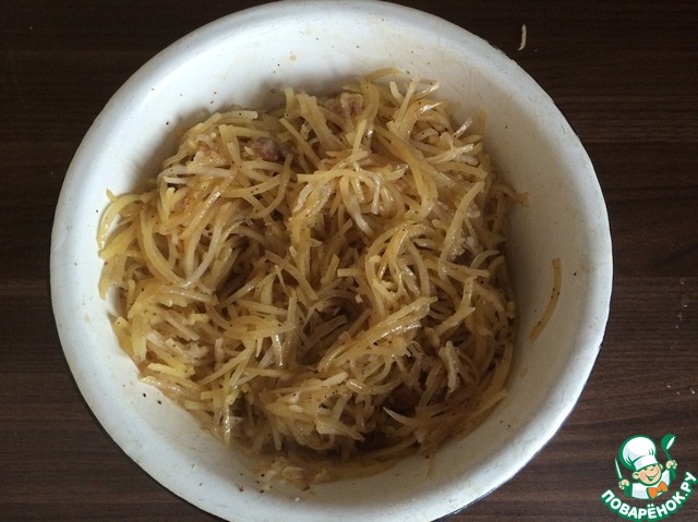 5. Горячую массу со сковороды переложить в картофель , который к тому времени уже стёк и остыл и перемешать и немного посолить (по вкусу)