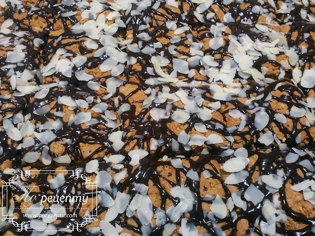 - Еще теплый пирог разрезать на коржики, полить растопленным шоколадом или шоколадной глазурью и посыпать миндальными хлопьями.