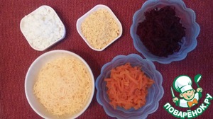 Натереть свеклу, морковь, сыр, белок и желток в разную посуду.