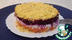 - Очередность слоев: картофель, рыба, лук, яблоко, морковь, сыр, свекла.