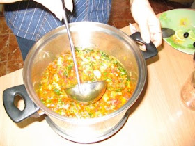 На приготовление солянки с момента закрытия крышкой нужно минут 20. За это время нужно вскипятить воды или подогреть куриный бульйон. Жидкости нужно около 2-х литров. Когда верхний этаж готов, мы его снимаем. А в солянку заливаем жидкость, добавляем специи и соль по вкусу, доводим до кипения и выключаем. Обычно я накрываю после этого солянку крышкой и даю возможность ей минут 5 настояться. Пока я готовлю тарелки куда насыпать. На дно тарелки я кладу ломтик лимона и 3-4 маслины.
