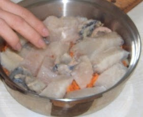 На пустую поверхность кладем ломтики яблок. Сверху на яблоки укладываем ломтики рыбы. Накрываем крышкой и ставим на огонь. 10-12 минут – и блюдо готово!